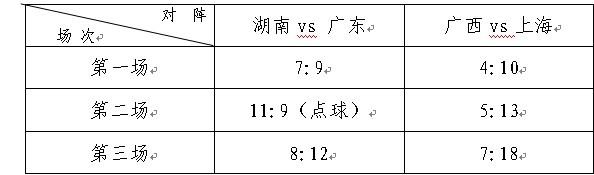 2012年全国男子水球联赛常规赛第五轮比赛于12月15日至17日在湖南、广西分别展开。湖南主场对阵广东,取得1胜2负的成绩;广西主场对阵上海,3场皆负。比分如下: